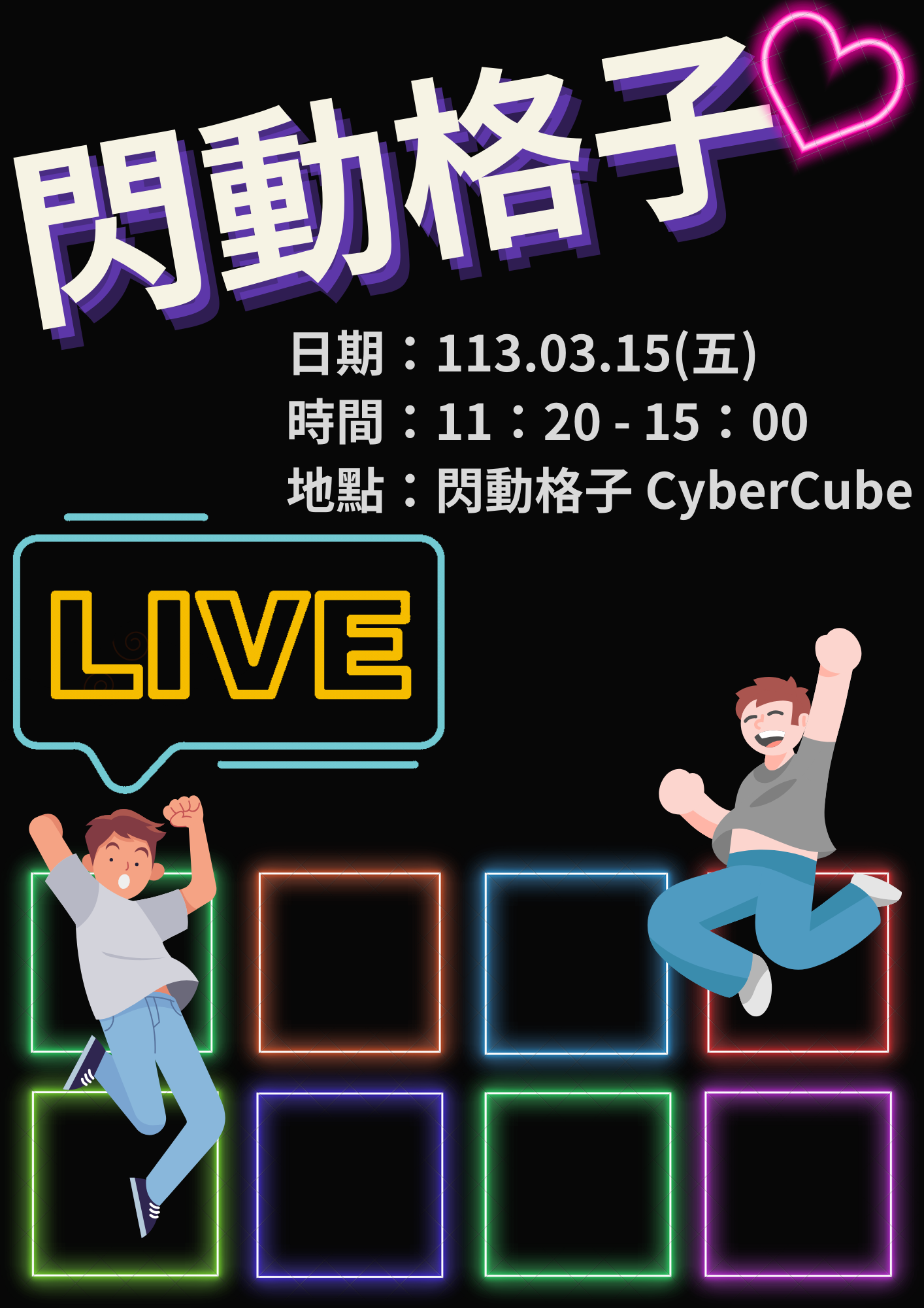 113年03月15日(五) 11:20~15:00 活動地點:閃動格子CyberCube ![]() | ||